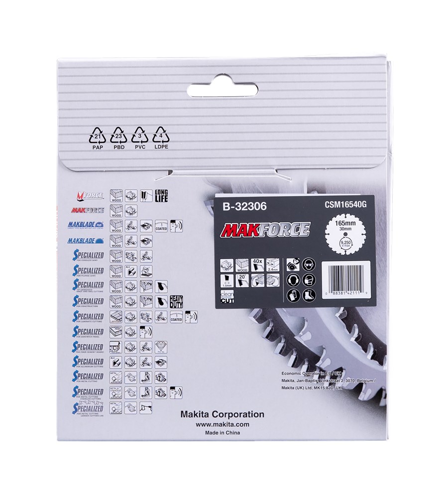 Zaagblad met ATB-vertanding. Geschikt voor het zagen van hout. Zaagbladen in de serie Makforce zijn specifiek ontworpen voor de cirkelzaag. Volledig geharde en gespannen cirkelzaagbladen om krachten te absorberen en geheel vlak te blijven. De hoogwaardige hardmetalen tanden zijn precies geslepen. Tevens hebben deze bladen een dun standblad om het vermogenverlies tot een minimum te beperken.