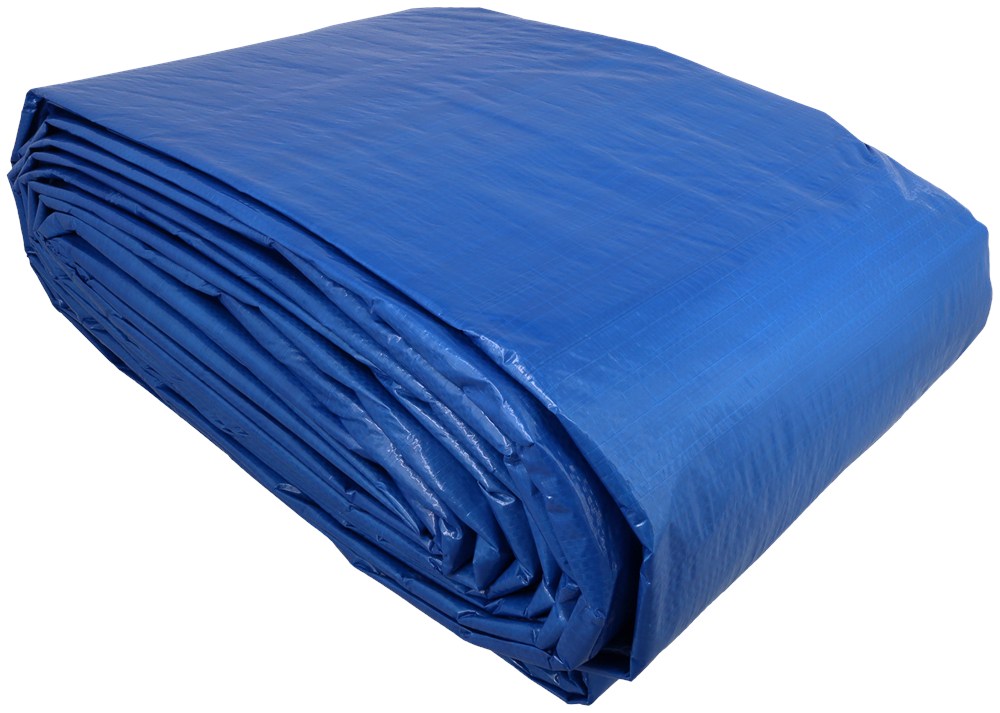 Lagedruk P.E., geweven en gecoat aan beide zijden. Voorzien van omzoomde rand, met ogen. Kleur blauw, 130 g/m².
