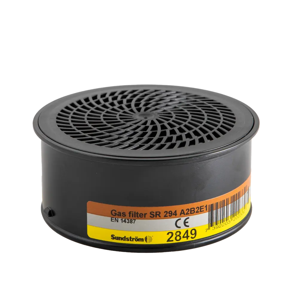 Gasfilter SR 294 is ontworpen voor gebruik met Sundström halfgelaatsmaskers en volgelaatsmaskers. De filters zijn van het type A2B2E1 en bieden bescherming tegen de volgende soorten gassen en dampen: Type A beschermt tegen organische gassen en dampen, zoals oplosmiddelen, met kookpunten > +65 °C. Type B beschermt tegen anorganische gassen en dampen, zoals chloor, waterstofsulfide en waterstofcyanide. Type E beschermt tegen zure gassen en dampen, zoals zwaveldioxide en waterstoffluoride. Het gasfilter kan eenvoudig worden gecombineerd met deeltjesfilter SR 510 P3 R om ook bescherming te bieden tegen aerosolen (deeltjes), bijvoorbeeld tijdens het spuiten.