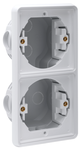 Deze tweevoudige verticale montagedoos is geschikt voor het inbouwen van twee spuitwaterdichte functies. Het geheel is spuitwaterdicht wat het uitermate geschikt maakt voor gebruik in vochtige ruimtes en ammoniakrijke omgevingen. Afwerkingskleur: grijs.