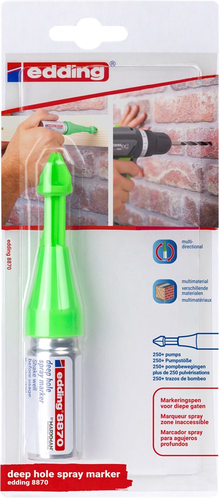 Deze niet-permanente krijt spray marker is ideaal voor het snel en goed zichtbaar markeren van boorgaten en bevestigingspunten tot 100mm diep met een diameter van 3-13mm. Werkt op praktisch alle opervlakken zoals steen, hout, metaal, gipsplaat en zelfs op vette ondergronden. Tot wel 250 keer te gebruiken. Ideaal voor het installeren en meten. De marker spuit neongroen krijt.