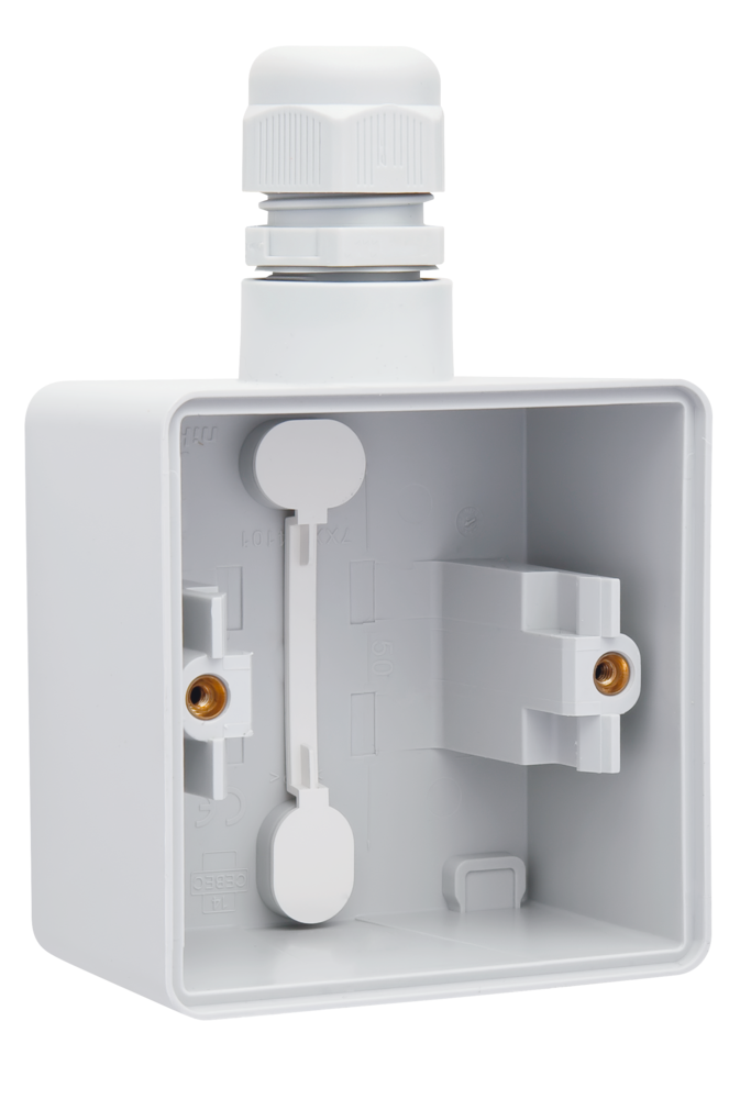 Materiaal opbouwdoosDe opbouwdoos is vervaardigd uit slagvast, stofwerend, halogeenvrij en zelfdovend polypropyleen (UL94-V2/1,6 mm).