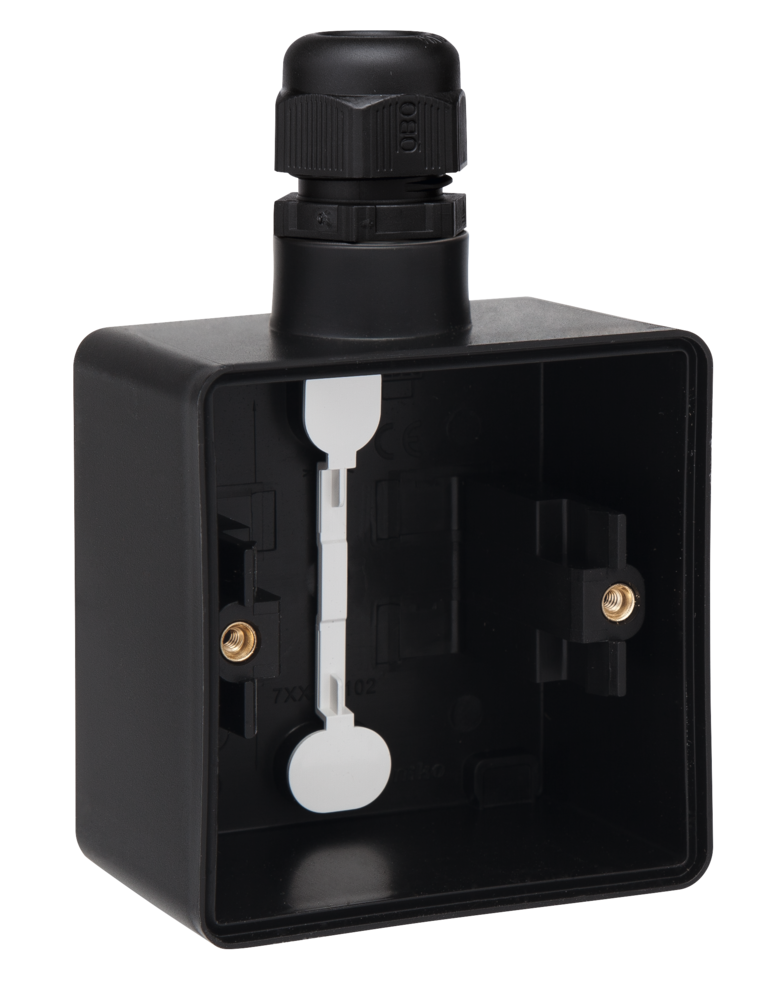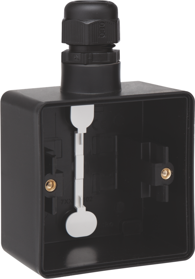 Spuitwaterdichte opbouwdoos met één M20-ingang met wartel voor het inbouwen van één functie, black. De bevestigingspunten bevinden zich 50 mm uit elkaar op een verticale as. Deze maataanduiding bevindt zich onuitwisbaar op de bodem van elke doos. De ovale schroefopeningen laten toe een onnauwkeurige boring op te vangen. Een afdichting waarborgt, door een persborging, de beschermingsgraad en de dubbele isolatie. De doos beschikt over twee diagonaal uitbreekbare condensatieopeningen. De opbouwdoos is vervaardigd uit slagvast, stofwerend, halogeenvrij en zelfdovend polypropyleen (UL94-V2/1,6 mm).