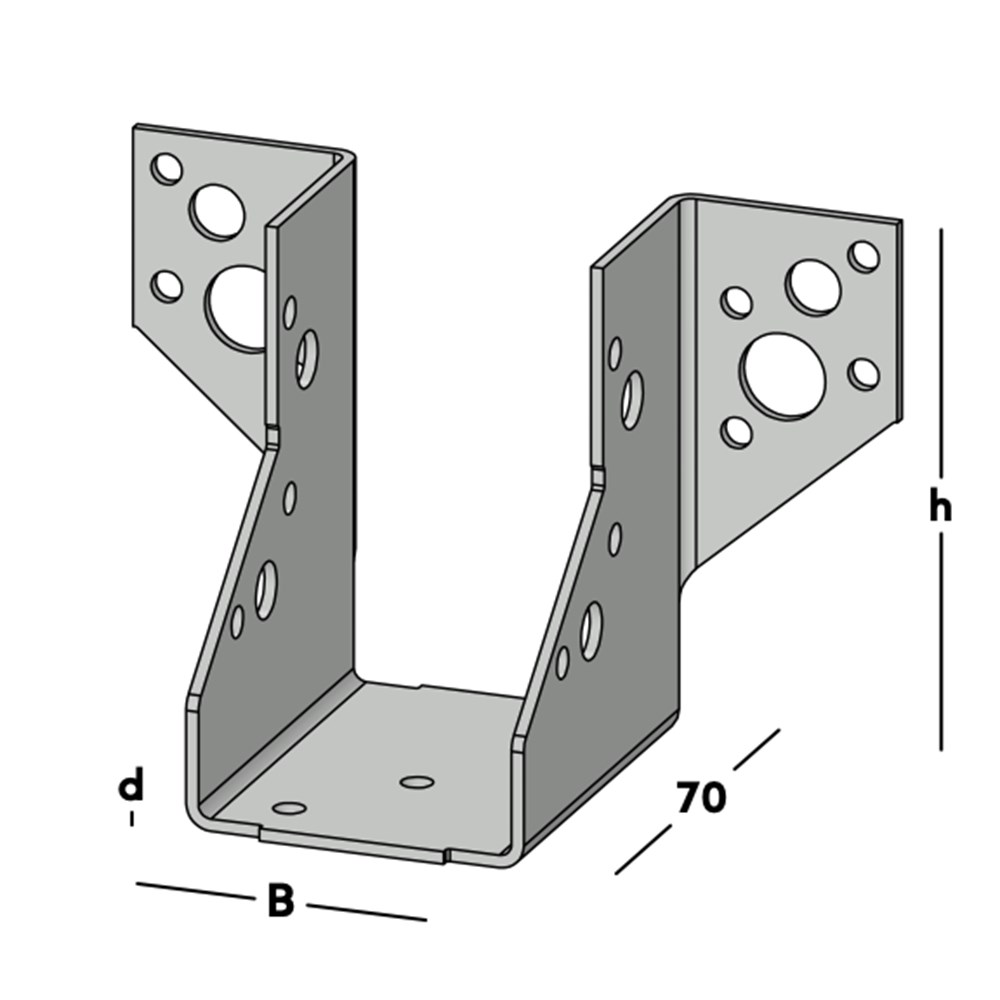 Balkdrager 220/50 met zijflenzen, voor het bevestigen van dwarsbalken rechtstreeks tegen de muur of tegen een andere houten balk. Deze balkdrager wordt ook toegepast voor het maken van ravelingen in vloeren en daken. Leverbaar voor de gangbare kopmaten van zowel geschaafd als ongeschaafd hout
