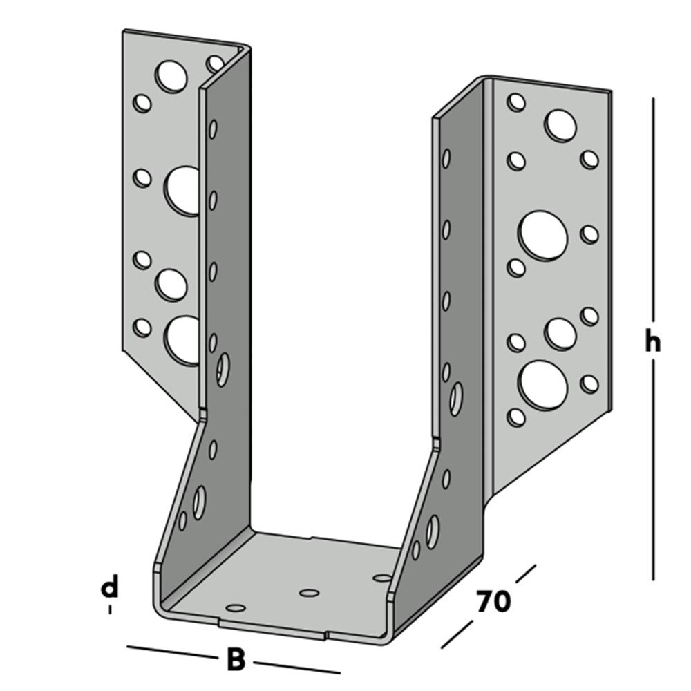 Balkdrager 335/63 met zijflenzen, voor het bevestigen van dwarsbalken rechtstreeks tegen de muur of tegen een andere houten balk. Deze balkdrager wordt ook toegepast voor het maken van ravelingen in vloeren en daken. Leverbaar voor de gangbare kopmaten van zowel geschaafd als ongeschaafd hout
