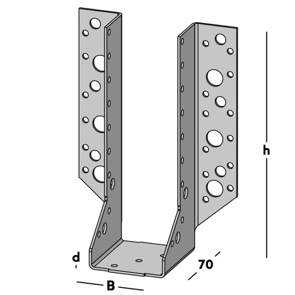 Balkdrager 440/59 met zijflenzen, voor het bevestigen van dwarsbalken rechtstreeks tegen de muur of tegen een andere houten balk. Deze balkdrager wordt ook toegepast voor het maken van ravelingen in vloeren en daken. Leverbaar voor de gangbare kopmaten van zowel geschaafd als ongeschaafd hout