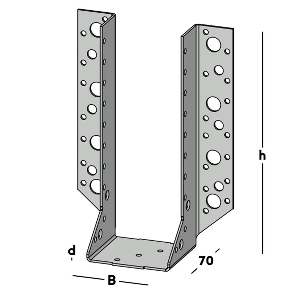 Balkdrager 500/75 met zijflenzen, voor het bevestigen van dwarsbalken rechtstreeks tegen de muur of tegen een andere houten balk. Deze balkdrager wordt ook toegepast voor het maken van ravelingen in vloeren en daken. Leverbaar voor de gangbare kopmaten van zowel geschaafd als ongeschaafd hout