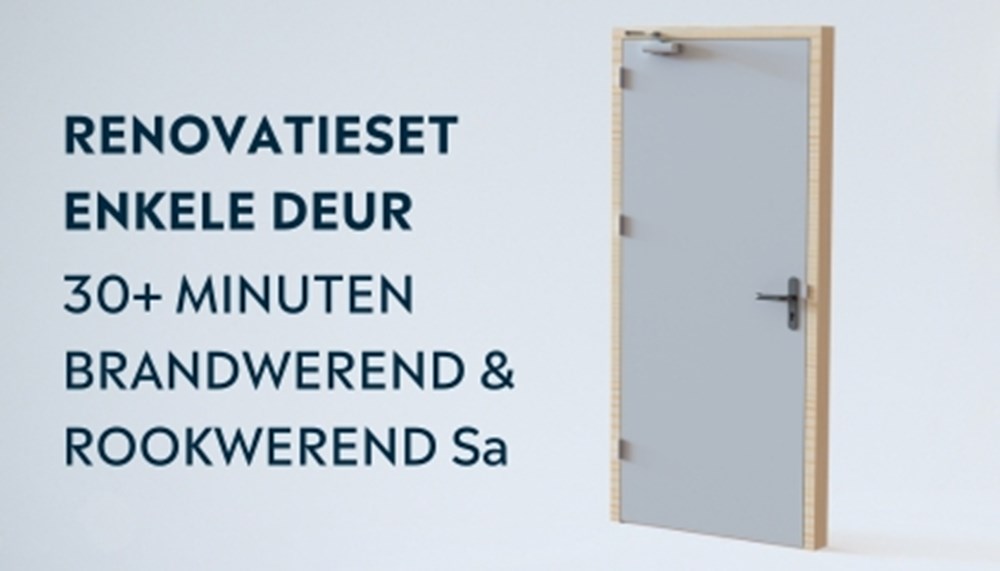 Alprokon renovatieset voor het opwaarderen van bestaande enkele deuren naar 20 of 30 minuten brandwerendheid en Sa rookwerendheid. De set is geschikt voor deuren met een sponning van 25 mm en biedt een efficiënte oplossing om bestaande deuren te laten voldoen aan actuele brand- en rookwerende eisen.