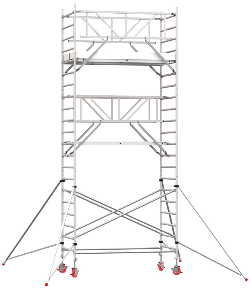 Rolsteiger breed met platform van 190 lang voor elke professionele klus. De geknepen klauw-schoorbuisverbindingen maakt de rolsteiger sterk en brengt je tot een maximale werkhoogte van 10.20 meter hoog zowel binnen als buiten. Rondom gelaste sporten maken het frame ijzersterk en 100% betrouwbaar. Met brede frames van 1,35 meter en een belasting tot 250 kg per platform en is verkrijgbaar in de lengte: 1,90 of 2,50 meter. Brede rolsteigers hebben een frames van 1,35 meter, dat betekent dat er twee platformen naast elkaar kunnen liggen waardoor je een nog grotere werkoppervlakte creëer. Met de innovatie Safety Handrail plaats je al vóór het betreden van het platform een permanente leuning en voldoet daarmee aan de veilige opbouwmethode van 2018. Zo ben je rondom beschermd op elk niveau. De rolsteiger wordt geleverd met houten platformen en kantplanken, vertrouwd en degelijk. Deze staat stevig op z’n plek met de dubbelgeremde wielen tot 10 cm opspindelbaar.