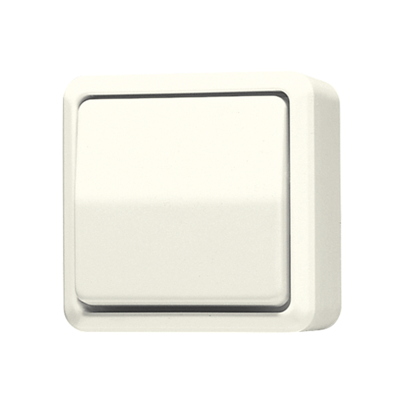 Jung AP600 wisselschakelaar, wip/druk, 1-voudig, 10A, verlicht, met behuizing, opbouw, schroef, IP20, glans crèmewit RAL1013.