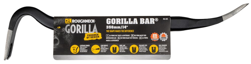 Roughneck® Gorilla Bars - De vorm maakt het verschil. De legendarische Roughneck® Gorilla Bar biedt verbeterde toegang voor maximale hefboomwerking en is misschien wel de beste sloopstang op de markt. Het ovale profiel is gesmeed en hittebehandeld voor uitzonderlijke sterkte en duurzaamheid. Het verbetert de structurele sterkte nog verder en biedt verbeterde grip en comfort. Brede klauw met laag profiel zorgt voor gemakkelijker penetratie en effectiever wrikken, voorzien van een gleuf voor het verwijderen van spijkers. De brede hiel verdeelt de kracht om schade aan het oppervlak van het werkstuk te verminderen. De poedercoating biedt een grotere weerstand tegen corrosie en de gepolijste punten minimaliseren de wrijving. Met afgeschuinde nagelverwijderaar voor het loswrikken van ingebedde nagels.