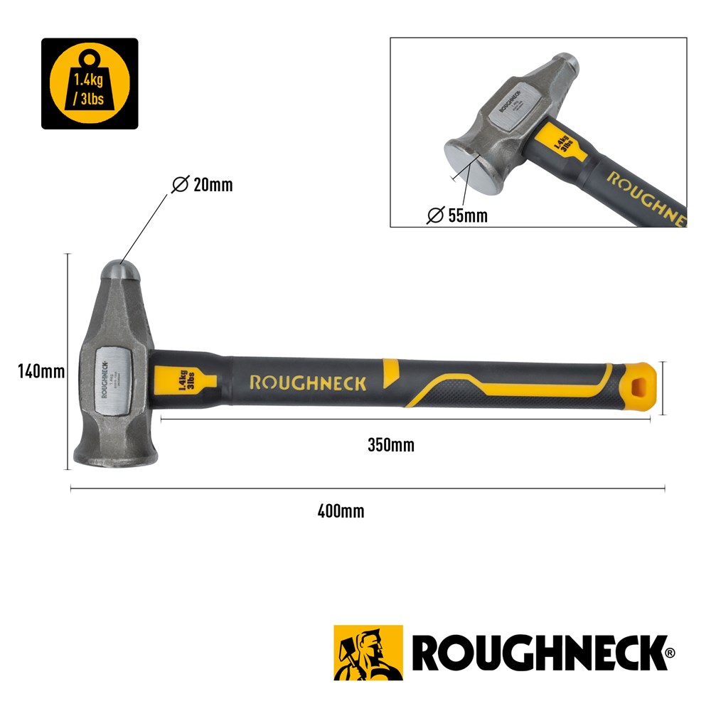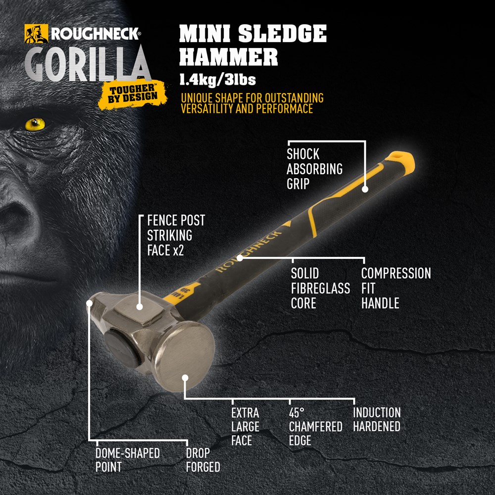 Roughneck Gorilla Mini Sledge Hammers hebben een unieke vorm voor uitstekende veelzijdigheid en prestaties. Het koepelvormige slagpunt oefent geconcentreerde kracht uit voor een effectievere sloop, terwijl het extra grote slagvlak het aantal misslagen vermindert. Beschikt ook over zijdelingse vlakken voor gebruik op houten schuttingpalen. Gesmeed uit hoog koolstofstaal, met inductiegeharde slagvlakken voor extreme sterkte en duurzaamheid. Gemonteerd op een compressie-gemonteerd, massief glasvezelkernhandvat met een schokabsorberende grip voor extra sterkte en comfort.