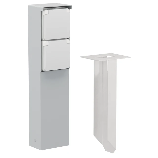 De tuinpaal bevat twee stopcontacten (16 A/250 Vac) met randaarde, beschermingsafsluiters en insteekklemmen. Hij heeft een IP55-beschermingsgraad en een pin die rechtstreeks in de grond moet worden gestopt. Door zijn functionele en knappe design is de tuinpaal perfect voor buiten, zoals op terrassen en in buitenkeukens. Het geheel is bovendien spuitwaterdicht en dus uitermate geschikt voor gebruik in vochtige ruimtes en ammoniakrijke omgevingen.