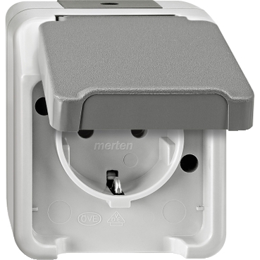 Dit stopcontact uit de Aquastar serie van Schneider Electric is voorzien van een klapdeksel, randaarde en kinderbeveiliging. De wandcontactdoos is lichtgrijs van kleur en de beschermingsdeksel heeft een donkergrijze kleur. Deze beschermingsdeksel bedekt het stopcontact volledig en wordt stevig dichtgehouden met scharnieren en een veer. Hierdoor is het gehele stopcontact spuitwater- en stofdicht.