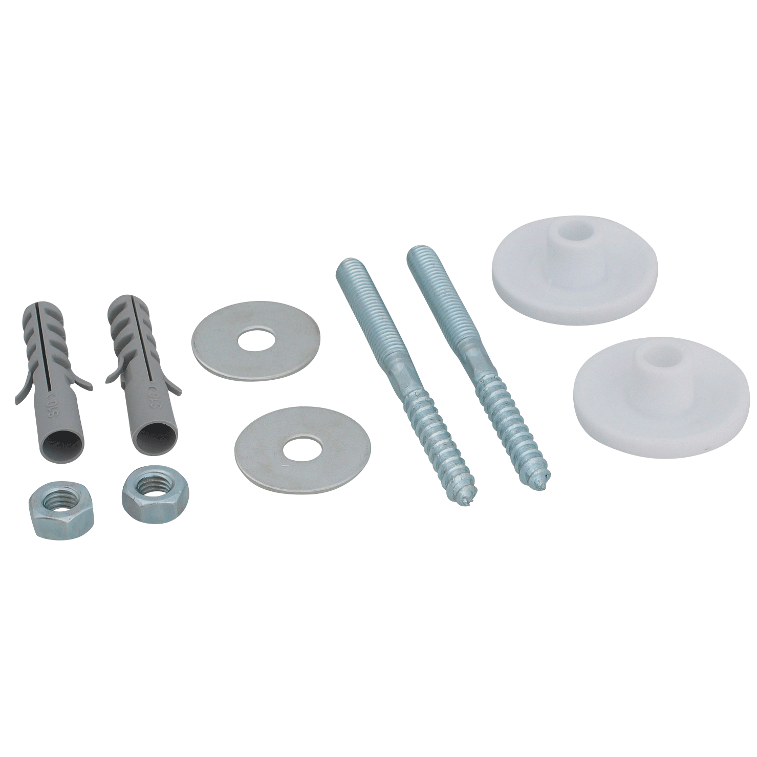 Elke set bestaat uit: 2 houtdraadpennen, 2 sluitringen, 2 zeskantmoeren, 2 kunststof geleidingsringen en 2 nylon pluggen.