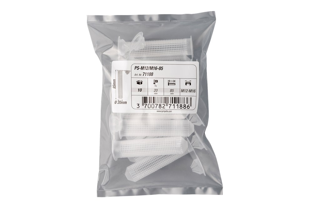 • Kunststof en stalen zeefhulzen voor het gebruik van Sympafix chemische ankers in holle of geperforeerde bouwstoffen.